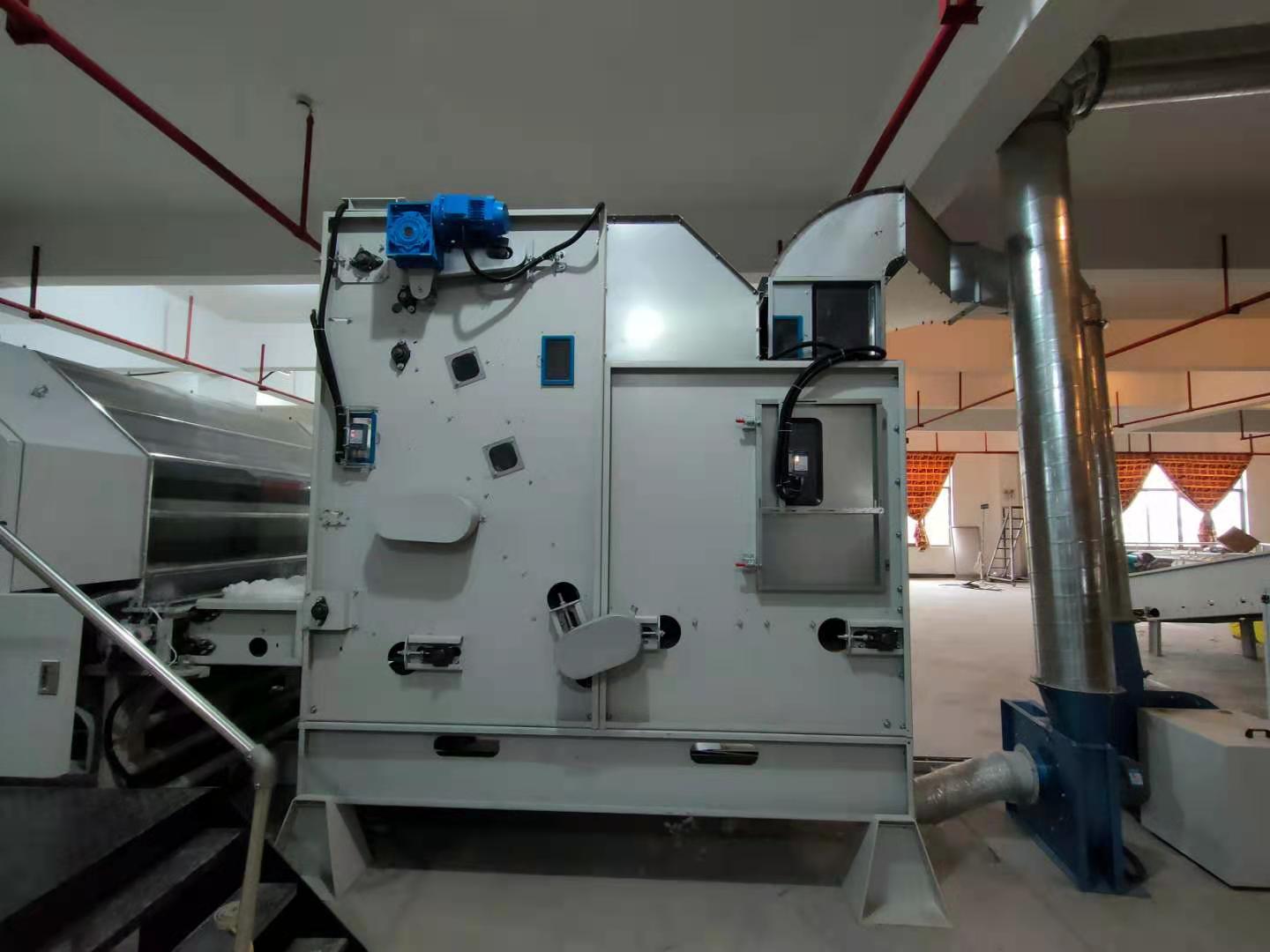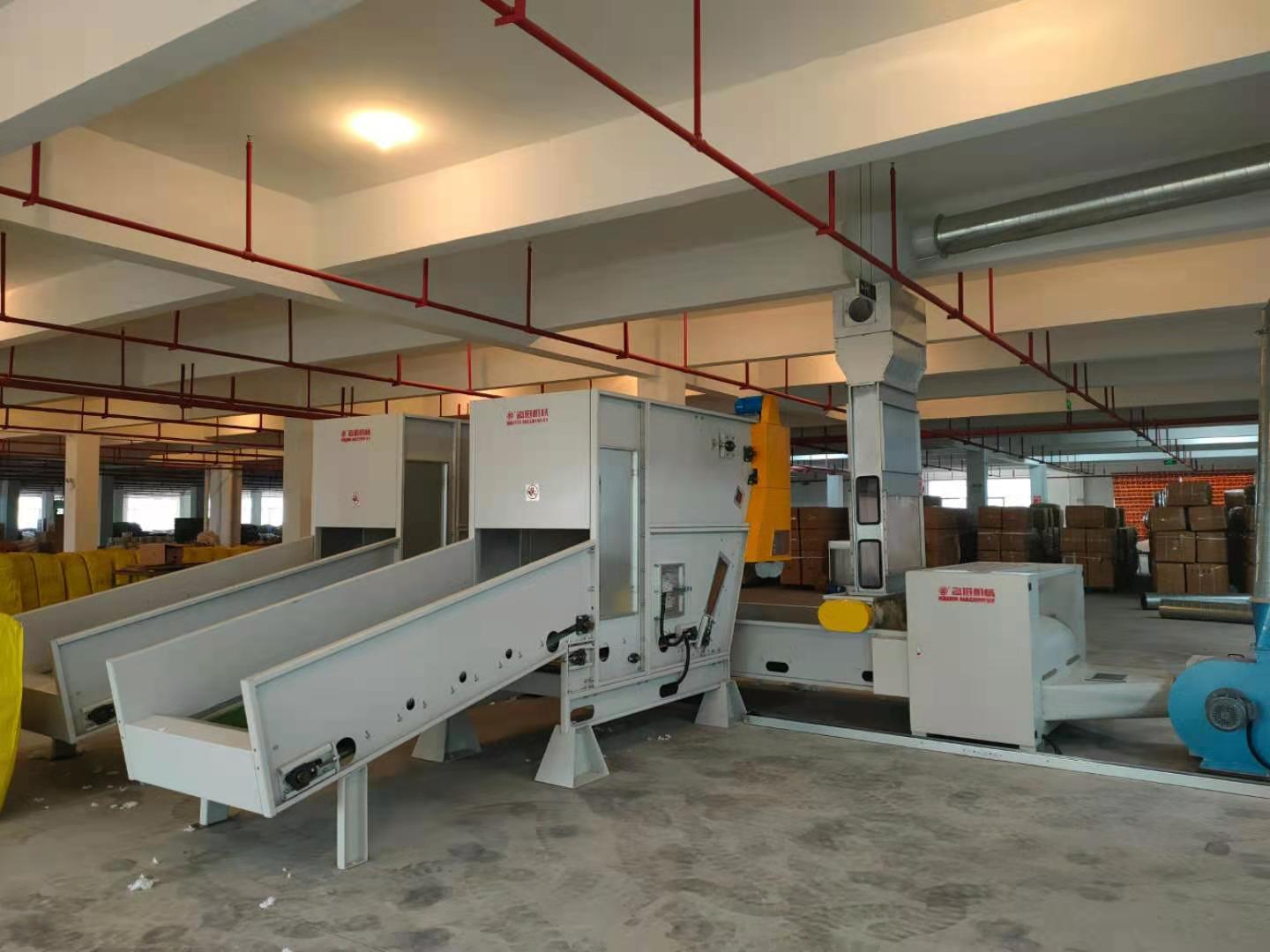 本生產(chǎn)線專為化纖填充被套的自動化生產(chǎn)設計,涵蓋從纖維梳理、填充物鋪網(wǎng)到被套封裝的全流程,具有高效、精準、衛(wèi)生等特點,適用于家紡、酒店用品、醫(yī)療寢具等領域的大規(guī)模生產(chǎn)。 化纖原料預處理 原料開松:將壓縮的化纖塊(如滌綸、PP棉等)通過開松機打散,形成蓬松狀態(tài)。 纖維梳理:通過高速梳理機將纖維梳理成均勻的網(wǎng)狀結構,確保填充物無結塊、厚度一致。 填充物鋪網(wǎng)與定型 交叉鋪網(wǎng)機將梳理后的纖維多層疊加,調節(jié)克重和蓬松度。 短程熱風定型(可選):通過低溫熱風穩(wěn)定纖維結構,增強回彈性。 被套裝配與封裝 自動裁切:按預設尺寸切割填充層,匹配被套外殼。 充填裝套:通過充填機將纖維層均勻填入預制的被套外殼,避免分布不均。 絎縫/封口:采用多針絎縫機固定填充物,或通過超聲波封口機完成密封(防螨抗菌需求場景)。 質檢與包裝 重量檢測:確保每床被子填充量符合標準。 金屬探測:排除生產(chǎn)過程中可能的金屬雜質。 自動折疊包裝:真空壓縮(可選)后裝箱。 高效率:全自動化流程,日產(chǎn)量可達2000~5000床(視規(guī)格而定)。 精準控制:PLC系統(tǒng)調節(jié)填充量、絎縫間距等參數(shù),誤差≤2%。 衛(wèi)生環(huán)保:封閉式填充環(huán)節(jié)減少粉塵污染,支持可回收化纖材料。 靈活適配:可快速切換不同被套尺寸(單人/雙人/加大)和填充克重。 智能分揀系統(tǒng):聯(lián)動MES系統(tǒng)實現(xiàn)訂單批次管理。 抗菌處理模塊:在線噴涂抗菌劑(適用于醫(yī)療、兒童用品)。生產(chǎn)線概述